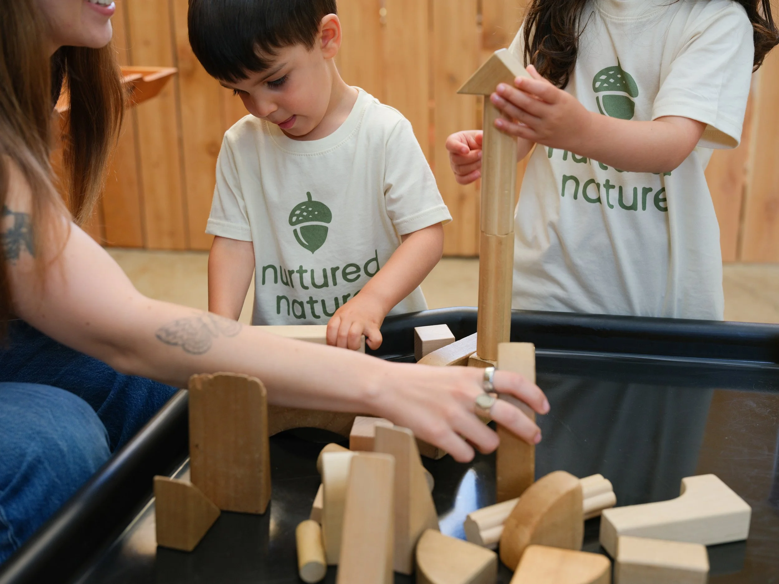 Children playing with wooden building blocks in a classroom setting.